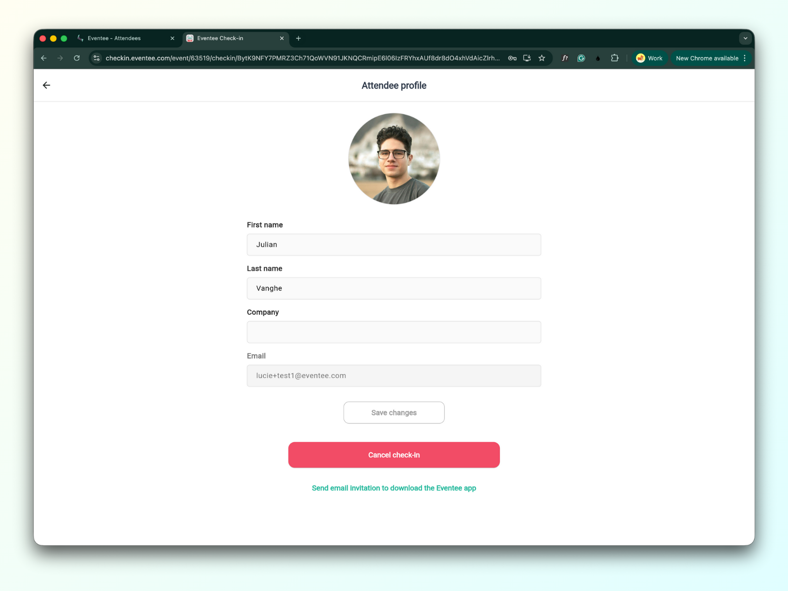 Kliknutím na jméno v seznamu účastníků si můžete zobrazit jejich profil. Zde můžete upravovat jejich údaje, zrušit odbavení (check-in) nebo odeslat e-mailovou pozvánku ke stažení aplikace Eventee.