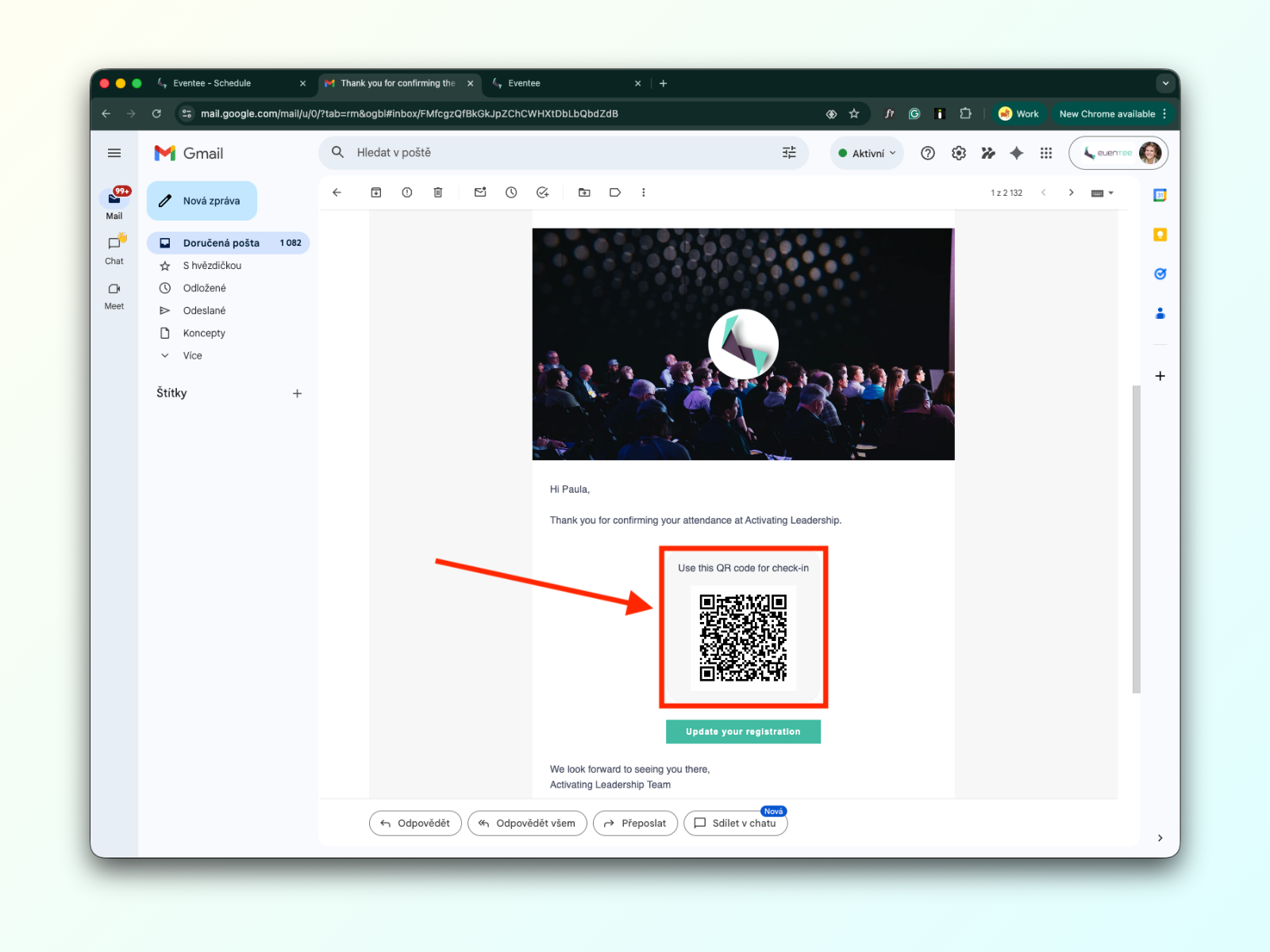 V potvrzovacím e-mailu najdete také QR kód, který slouží jako vaše vstupenka. Připravte si ho prosím u vstupu k naskenování.