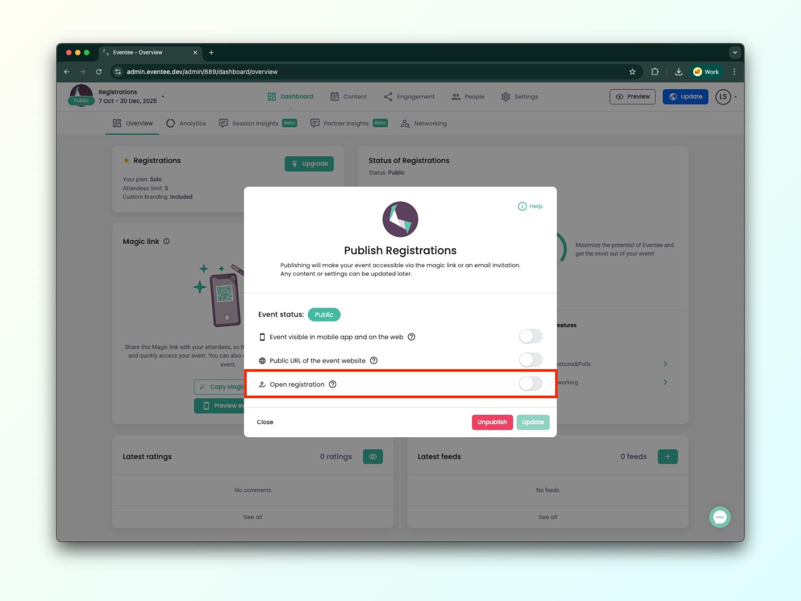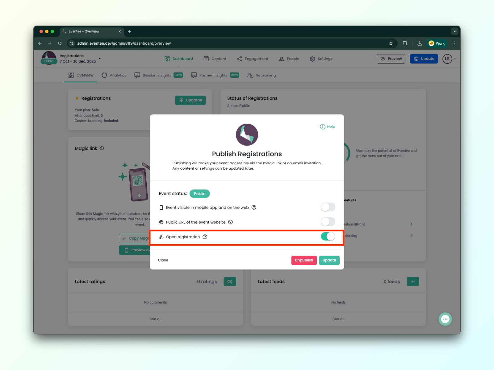 In the pop-up window, turn on the toggle button named "Open registration”.