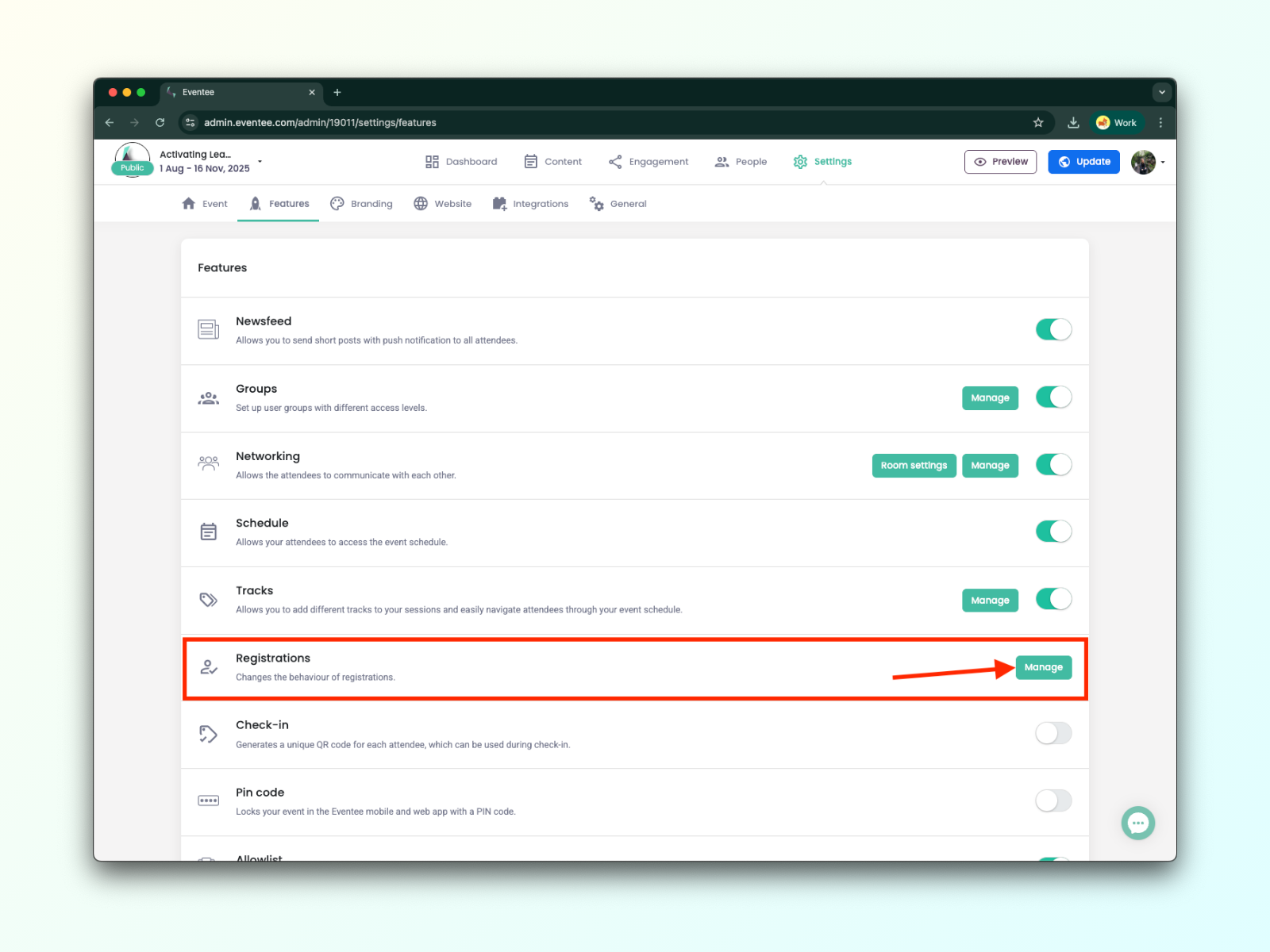 With Eventee’s registrations, you can set up an allowlist, which ensures that only invited registrants can RSVP, and auto-invitations to download the app. We refer to these features as Registration behavior.