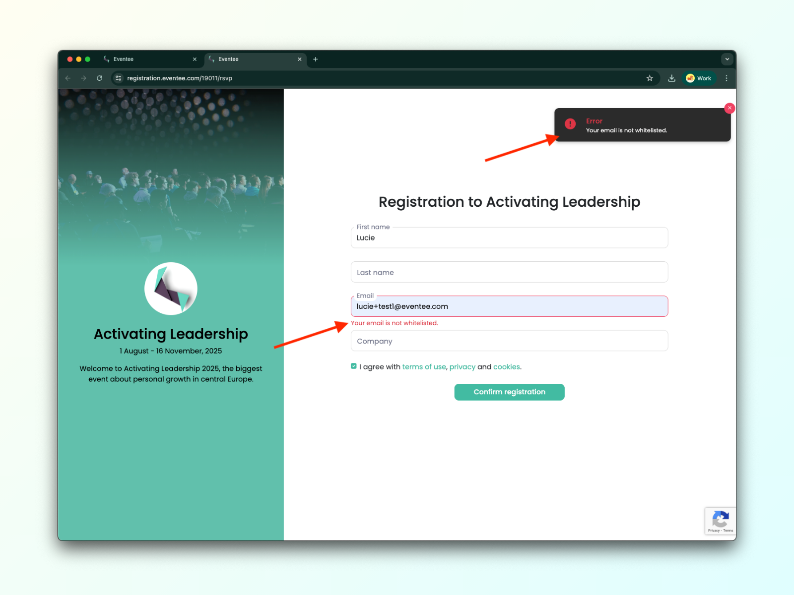 If an uninvited registrant fills out the registration form, they will see this warning message: "Your email isn’t on the allowed list."