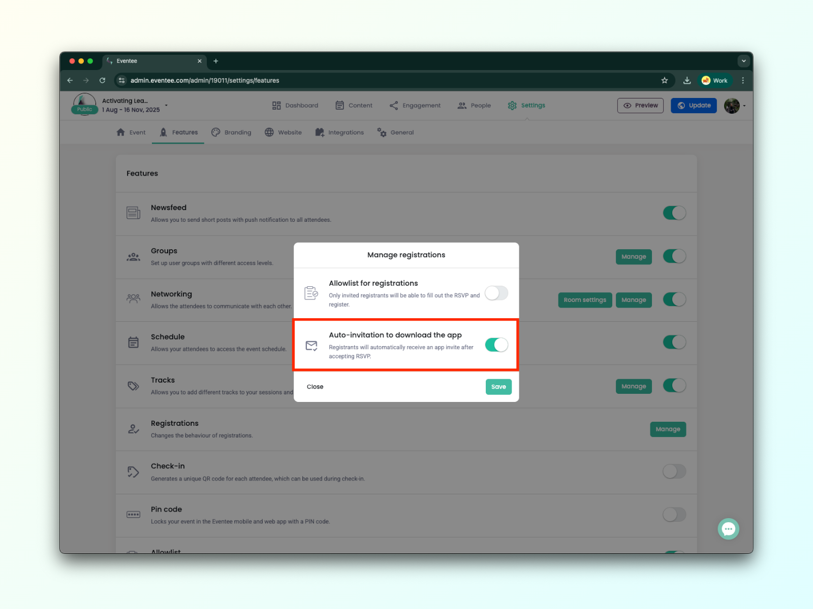 In the pop-up window, you can set up the Allowlist for registrations and Auto-invitation to download the app.