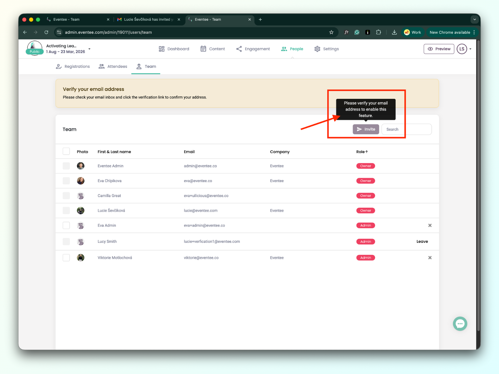 Inviting team members to the event and the company is not possible