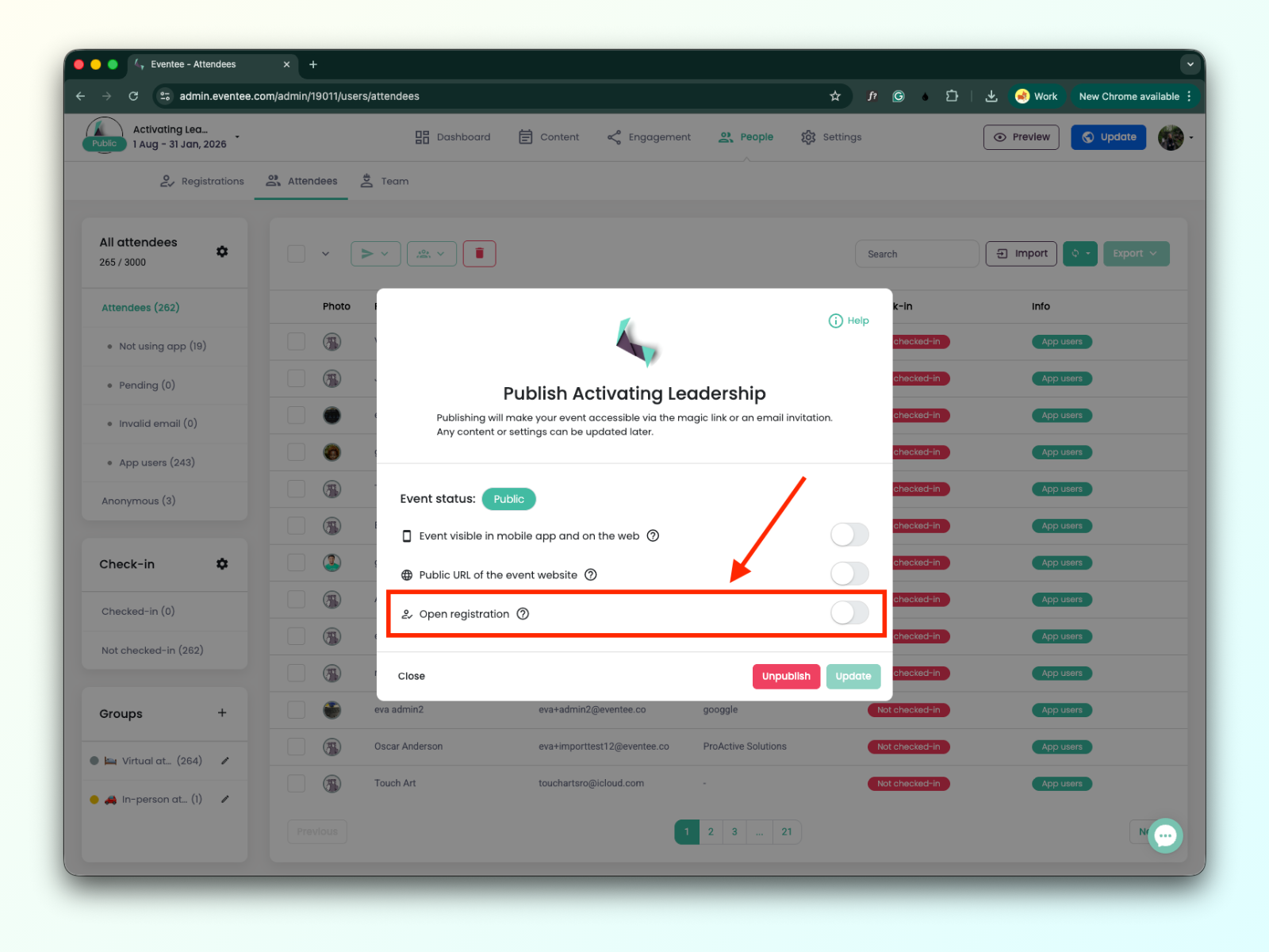 Cuando "Open registration" está activado, el registro está abierto y tus asistentes pueden completar el formulario de registro.