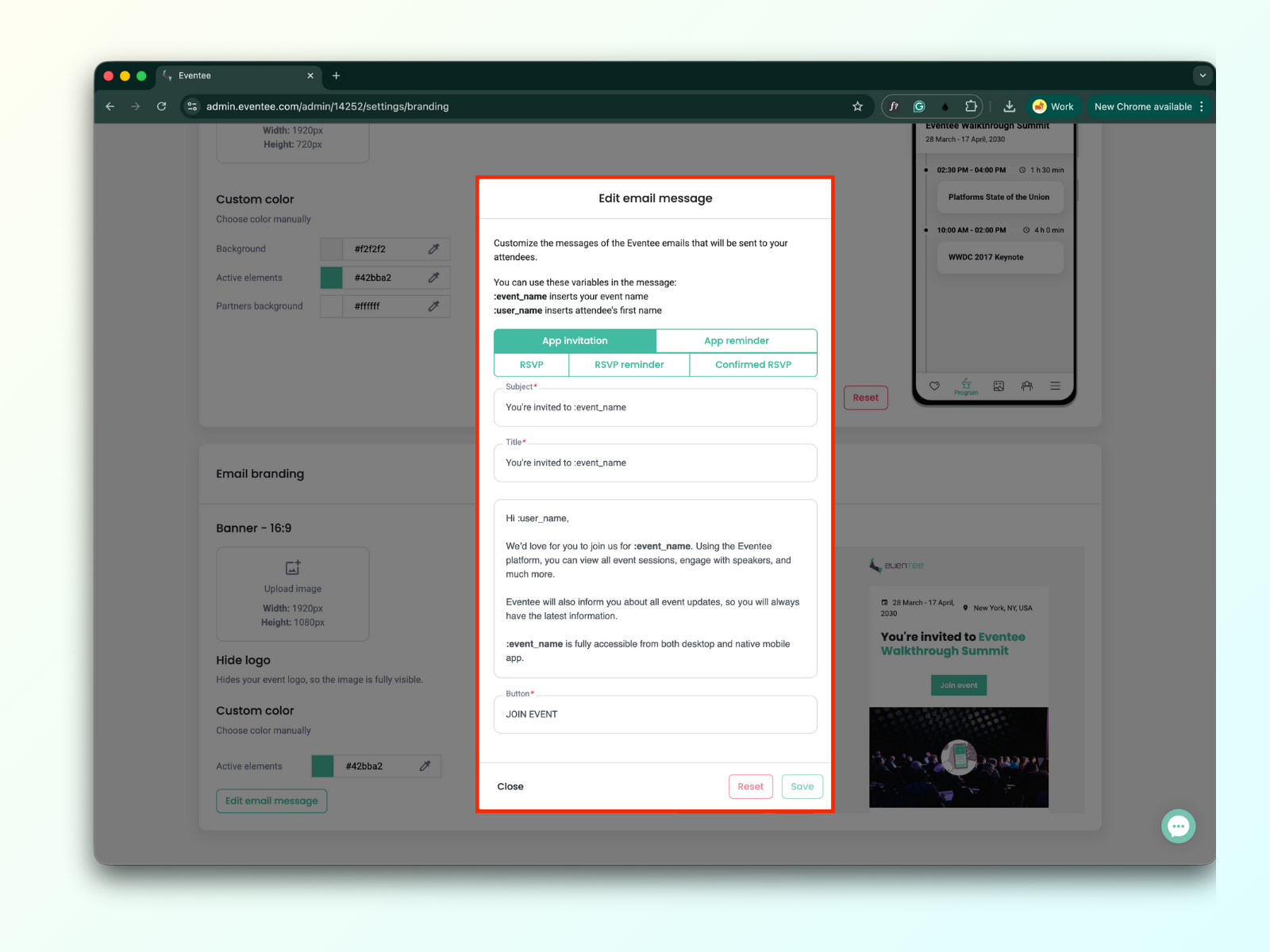Ja lopuksi, miltä mukautetulla brändäyksellä varustettu tapahtuma näyttää? Voit vapaasti selailla meidän brändättyä testitapahtumaa itse: Eventee Walkthrough Summit, 27. heinäkuuta tai katso vain alla olevat kuvakaappaukset.