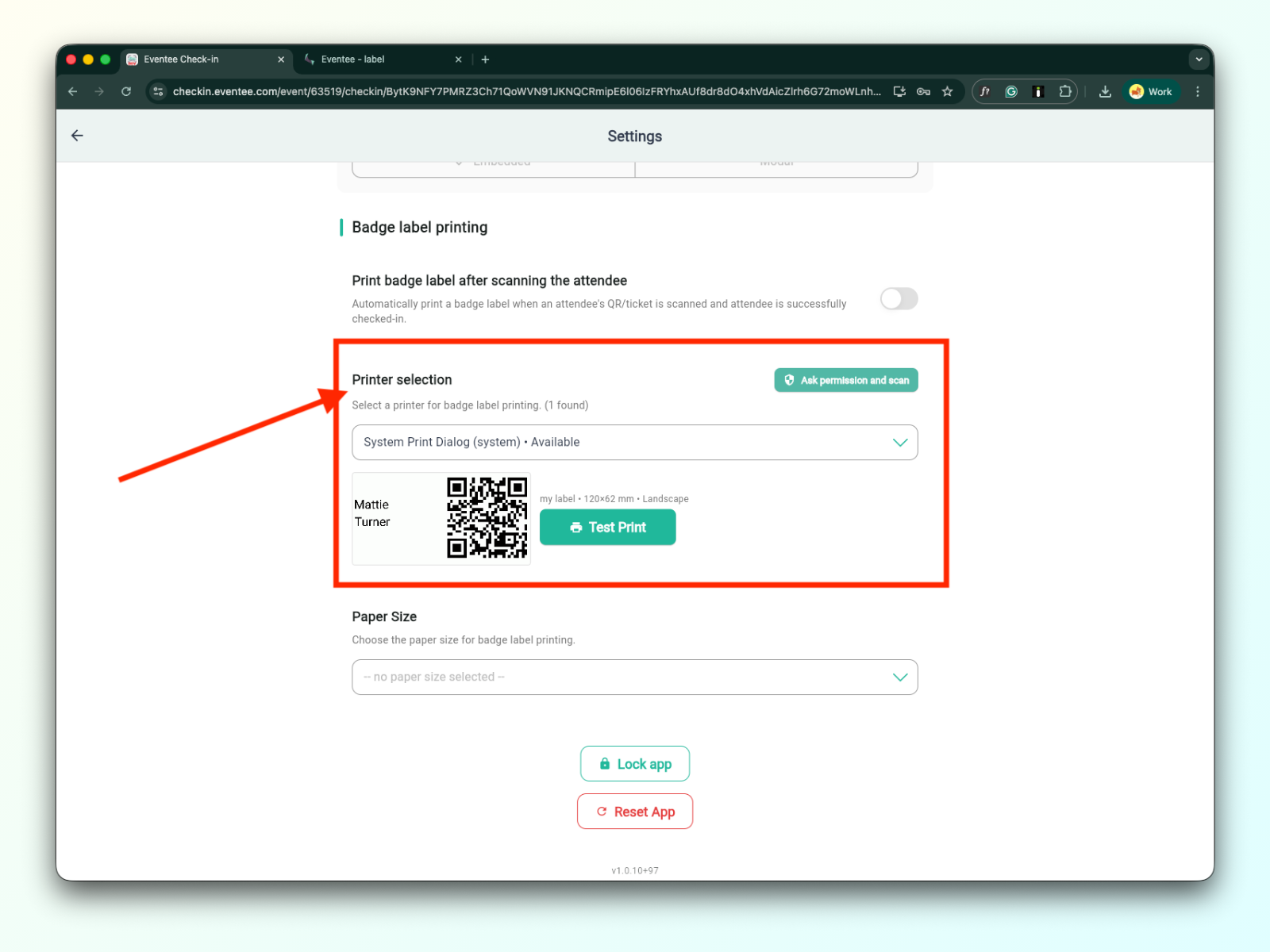 Toinen vaihe tarran luomisen jälkeen on asentaa ja yhdistää tulostin sen alustan mukaan, jota käytät tulostamiseen. Löydät tarkemmat tiedot artikkelista technical documentation for badge label printing.