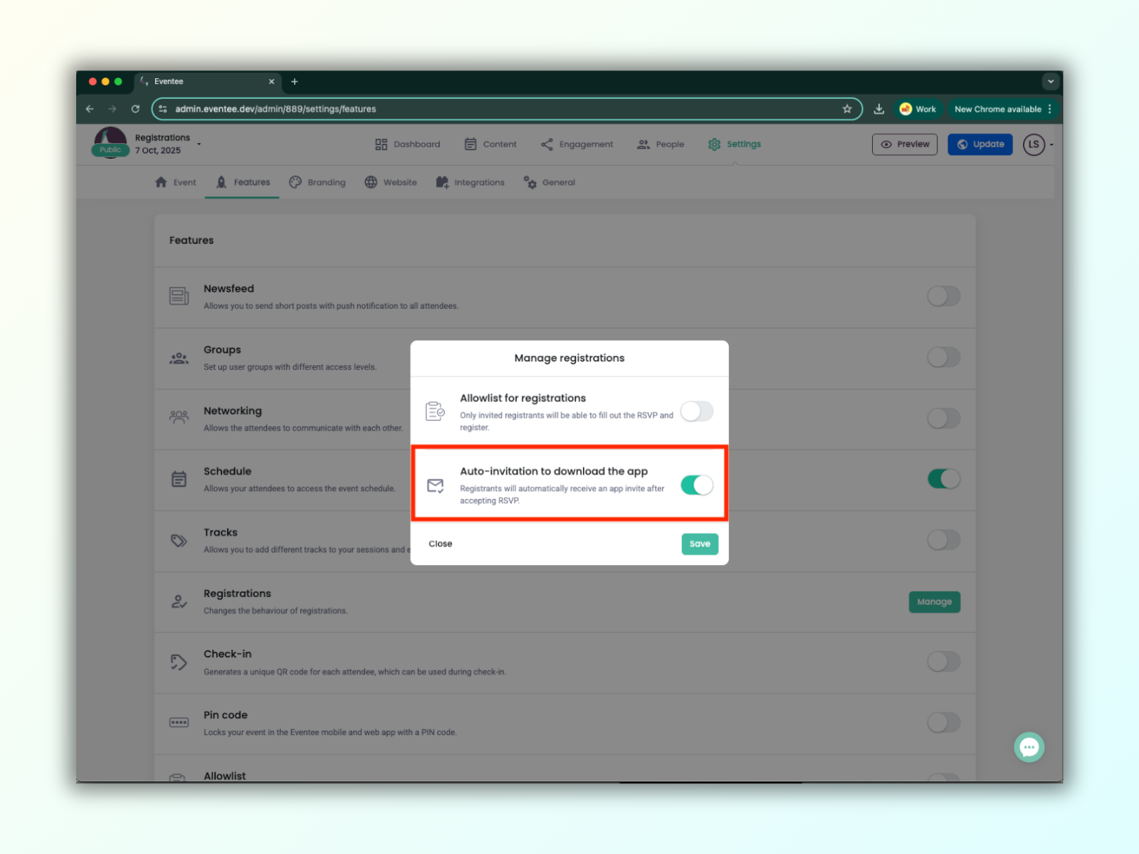 Keď kliknete na zelené tlačidlo Spravovať, otvorí sa popup okno, kde si viete nastaviť Allowlist pre registrácie a Automatické pozvanie na stiahnutie aplikácie.