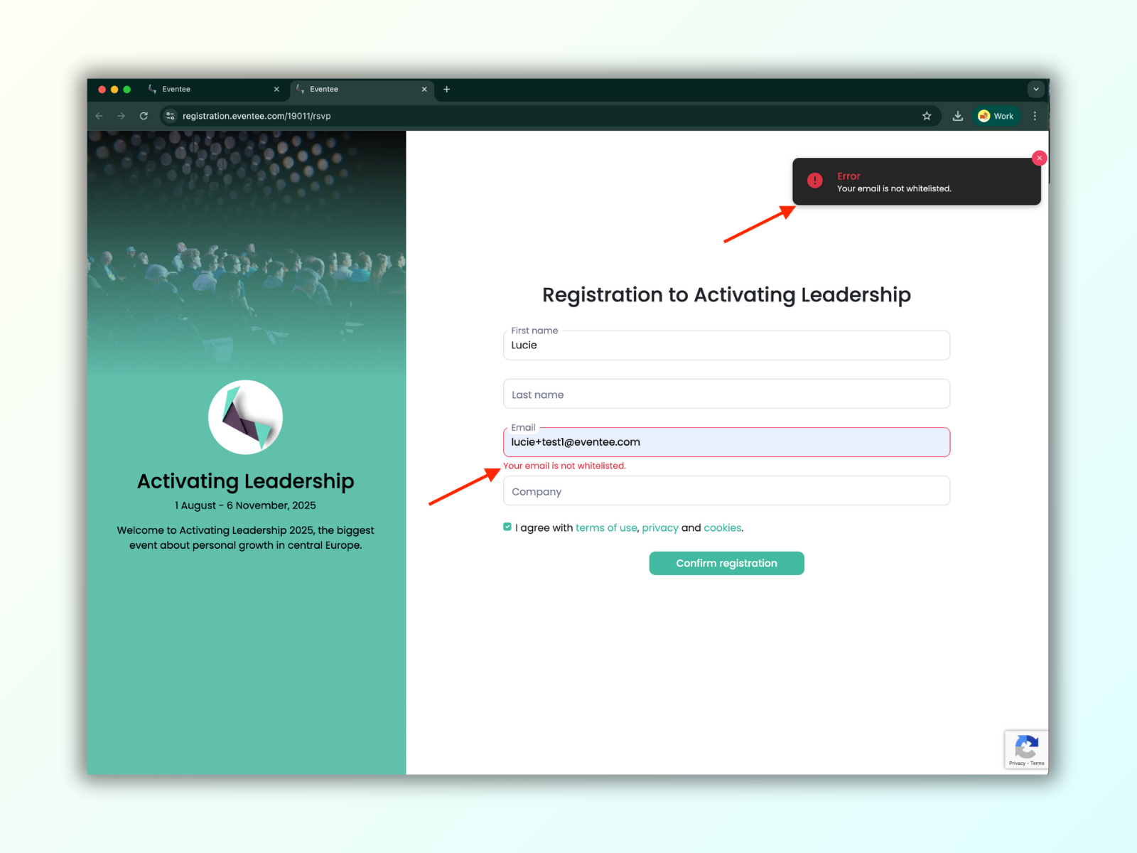 Ak je zapnuté, registráciu a vyplniť RSVP môžu iba pozvaní registranti. Ak formulár vyplní nepozvaný registrant, uvidí túto hlášku: "Tvoj e-mail nie je na povolenom zozname."